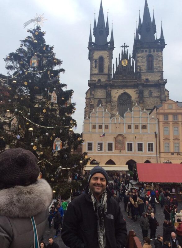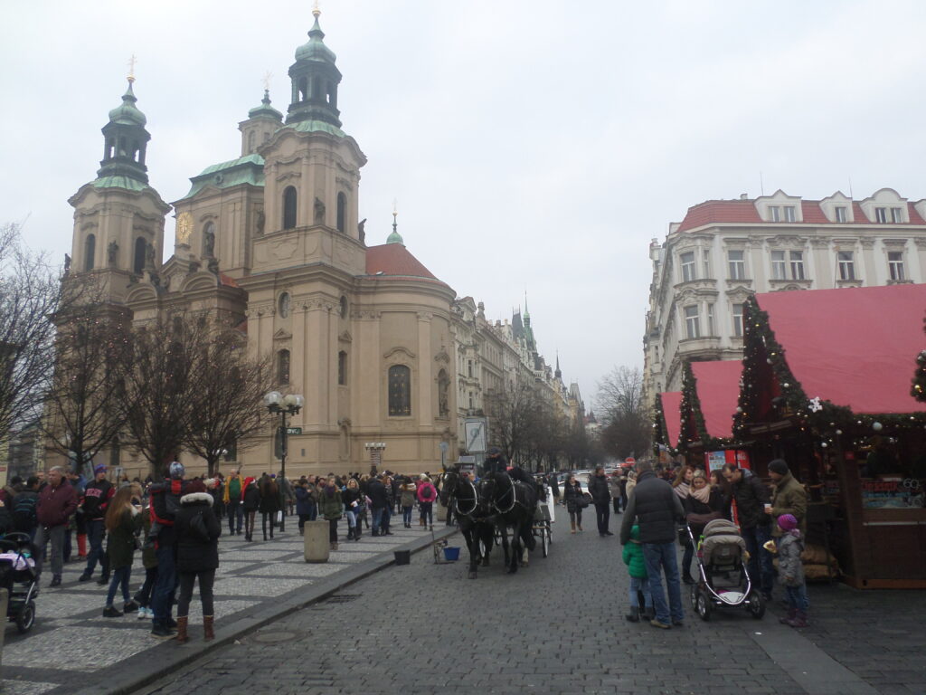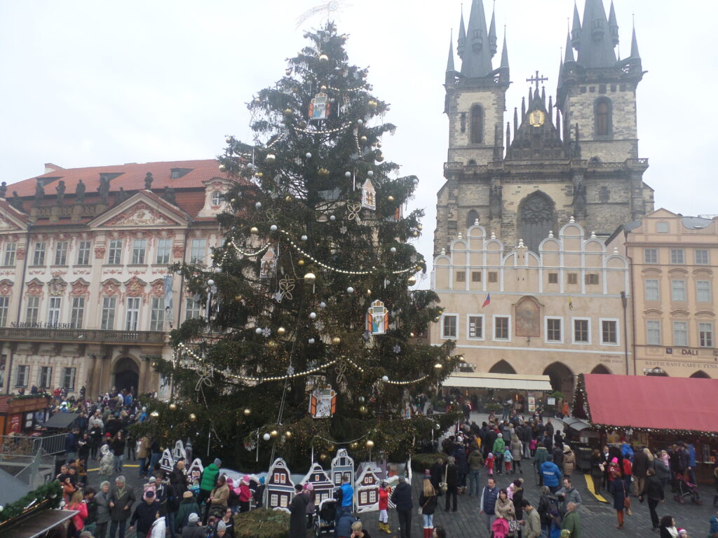 Pregunté la hora aquel día» eran las siete y media de la noche». Todo el espacio central de la plaza lo ocupaba la gente que se reunía para celebrar y ver el encendido del árbol de navidad. En aquel abeto gigante colgaban cadenas doradas con miles de adorno luces y una brillante estrella arriba en su copa. Levantaba la vista y sobresalía por encima de toda la iglesia de nuestra señora Tyn construida dentro de un patio con sus dos torres góticas y puntas puntiagudas como estalagmitas. La derecha ligeramente mayor más ancha y gruesa que la otra. Entre ellas demasiado bonito como para no llamar la atención sus remates ornamentales en cuyo frontón superior se peraltan sus figuras triangulares. Siempre eran las iglesias al igual que las mezquitas los edificios más esplendorosos y representativos. Me di cuenta entonces que estaba en Europa en la plaza de Praga al lado del monumento escultórico a Jan Hus como percusor de la reforma protestante y me veía rodeado de un conjunto variopinto de edificios de colores rosados, marrones claro, amarillo pálido. Uno con sus frescos pintados destacando san Wenceslao montado a caballo, otro notable con sus ventanas ojivales su fachada y campana de piedra. Alrededor todo un mercadillo lleno de puestecitos de madera con chillones techos de color rojo. Brillando en la calle las lámparas con guirnaldas de bombillas y decoraciones navideñas de todas formas y colores. Cantidad de puestos para comer y beber en el que también vendían bufandas, guantes, gorros, juguetes.