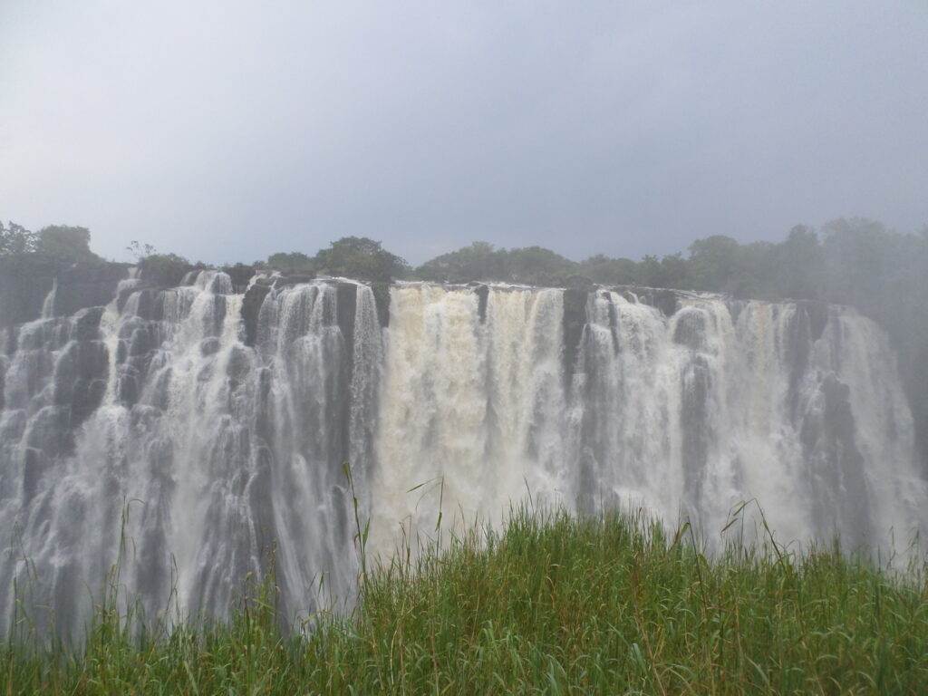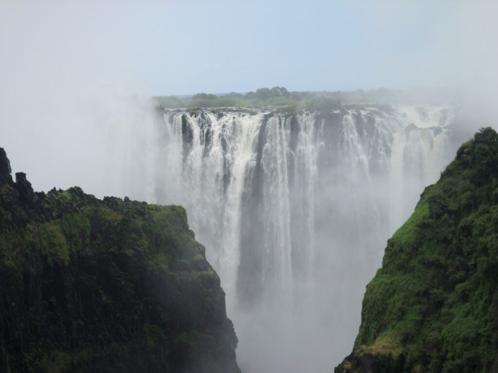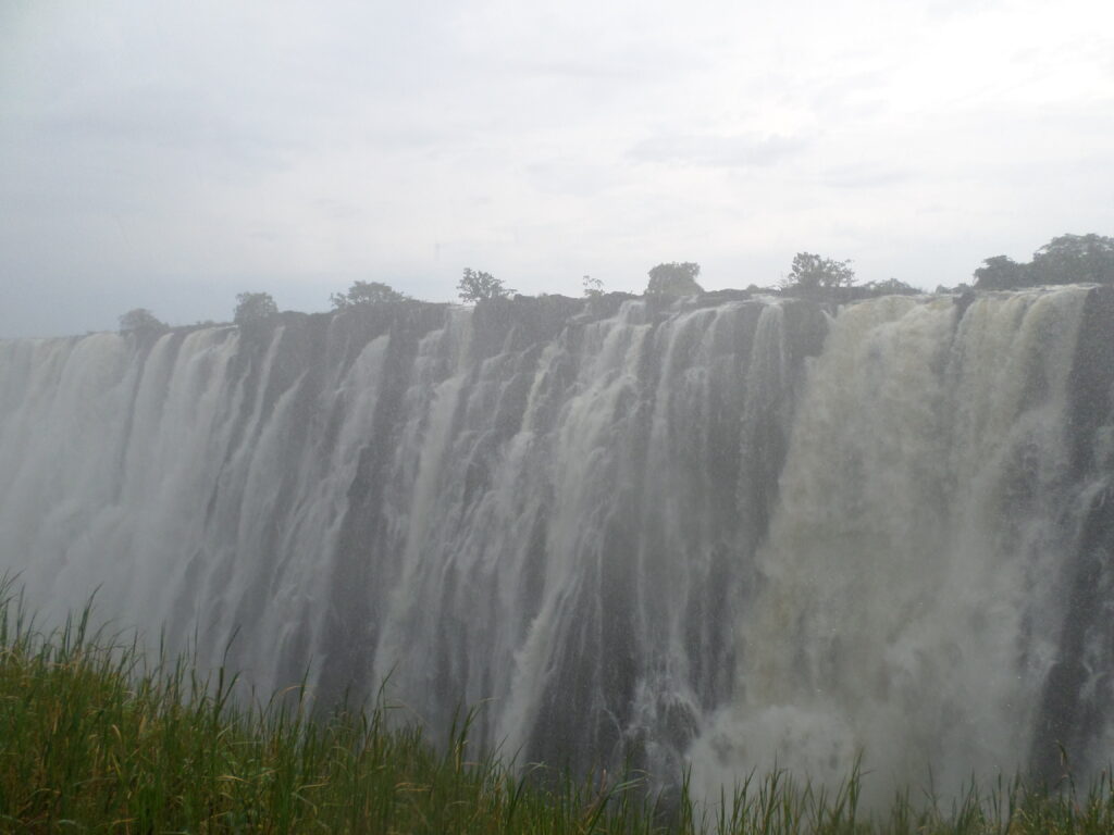 Desde Livingston nos acercamos en un taxi junto con otro huésped que estaba hospedado en el hotel hasta la entrada del parque. Un raudal de vida se extendió súbitamente sobre nosotros entre el suelo. En un bosque ribereño cubierto de vegetación sólo veía luz clara bajo el cielo azul y una bruma refrescante de agua que pulveriza todo a su alrededor. Levanté la mirada observando aquel espacio privilegiado intentando no perder la razón. Todo parecía unificarse y disolverse a la vez en aquel torrente de agua que aumentaba cada vez más con su fuerza. Las cataratas fueron un bonito escenario para la despedida. Era agua fría y aunque no podíamos sumergirnos al instante queda uno petrificado. Estando tan cerca desde las pasarelas se escucha un atroz estruendo del agua que se precipita abruptamente al vacío cubriendo una estrecha y escarpada garganta. Esa voluminosa corriente que nutre las aguas del río Zambeze cae ocultando las rocas desgarrándolas y haciendo un fuerte ruido que se transformaba en un vapor que cubre a los árboles y parece tragárselo todo. Me sentía profundamente emocionado pues brillaban los siete colores del arco iris y hasta la última gota que empapaba mi cuerpo era motivo de gozo, tanto que a pesar de acercarme desde la distancia dejando que el agua rozaba apenas mi piel de cualquier manera ver esa maravilla era suficiente. No en vano los nativos Kelolo la llaman “mosi oa tunya” o el “humo que truena”.